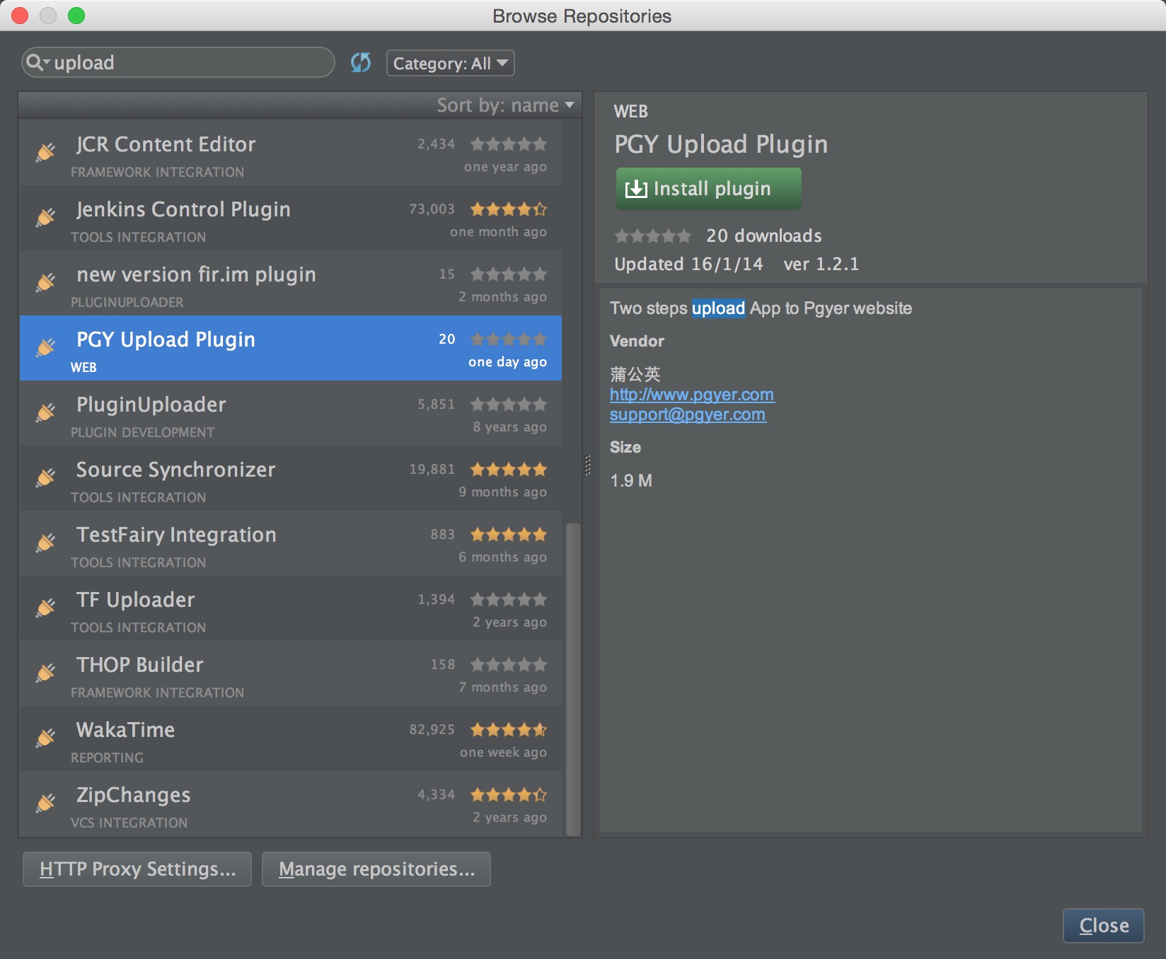 打开Android Studio -> Preference ->Plugin ->搜索框输入“PGY Upload Plugin”(如果找不到请点击Browse再次查找) -> 右边信息栏点击“install plugin”安装。重启Android Studio。