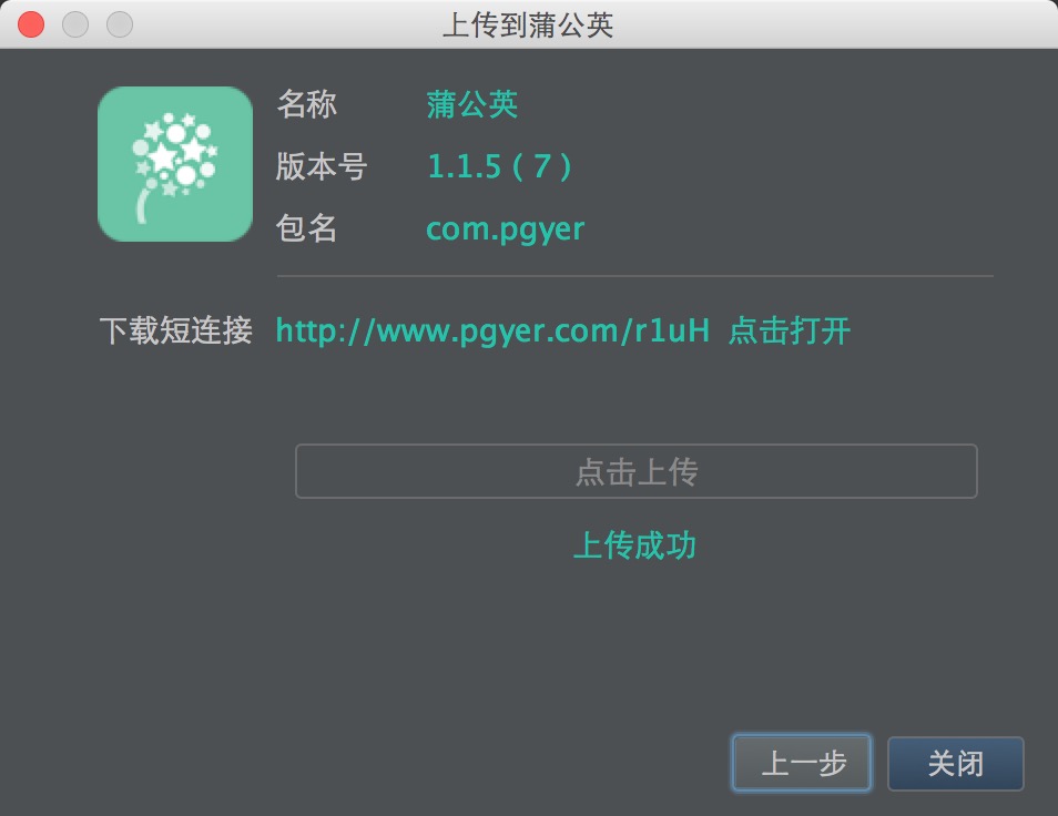 “点击上传”按钮,则开始上传app到蒲公英,显示进度条。如果上传成功则会提示“上传成功”以及显示该应用在蒲公英的「下载链接」。(这时候不可以再次点击上传按钮)