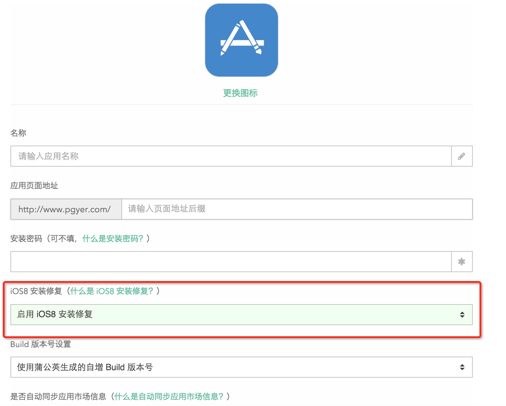 蒲公英为了兼容这些设备,提供了 iOS 8 安装修复的功能。该功能默认为关闭状态,开发者可以在 “应用管理” -> “编辑应用”-> “iOS 8安装修复”中开启此功能。